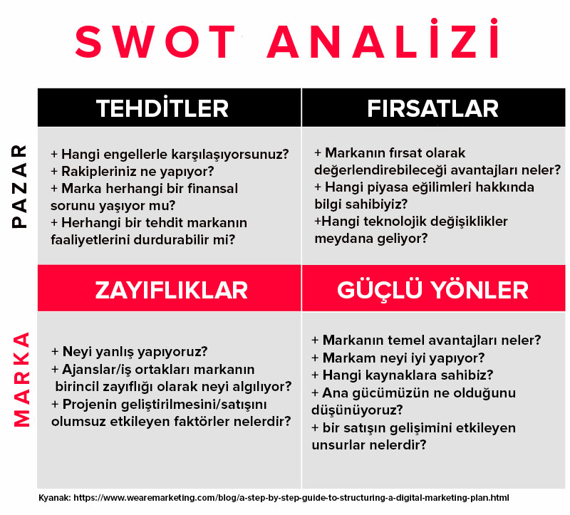 Dijital pazarlama planı oluşturmaya başladığınızda yapmanız gereken ilk şey, markanın iç ve dış analizini (SWOT analizi) yapmaktır. Her markanın güçlü ve zayıf yönleri ile önüne çıkacak fırsatlar ve tehditleri vardır. SWOT analizi, markanın güçlü ve zayıf yönlerini anlamanıza, fırsatların farkına varmanıza ve karşılaşabileceğiniz tehditleri görmenize yardımcı olacaktır.